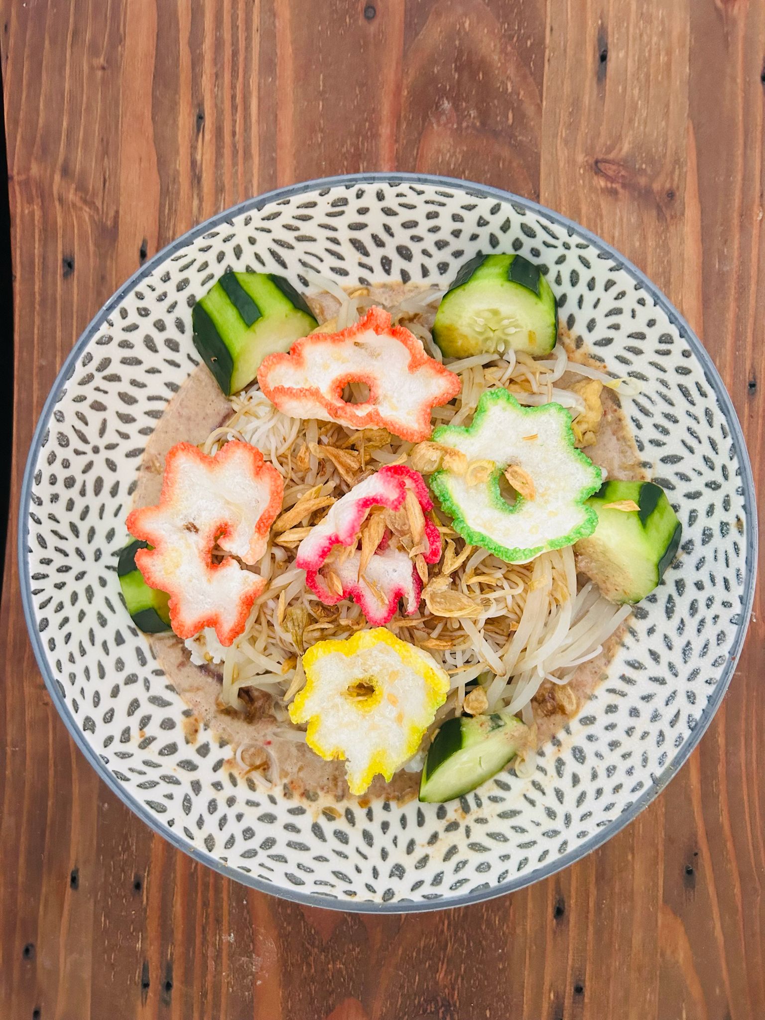 Ketoprak is a popular Indonesian dish of tofu, vegetables, rice cake, and rice vermicelli dressed in a special peanut sauce (our homemade secret recipe) and served with fried shallots and kerupuk