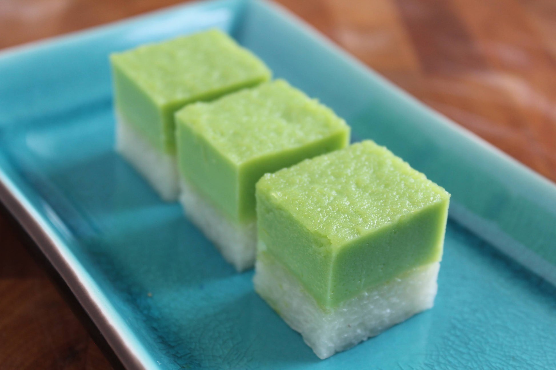 Ingredients: Mochi rice, coconut milk, egg, coconut cream, sugar, rice flour, pandan leaf, pandan extract